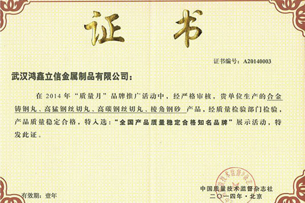武漢鴻鑫立信金屬制品有限公司主要從事鋼丸、鋼絲切丸、鋼砂等除銹防腐耗材的生產(chǎn)和銷售。公司所有產(chǎn)品均通過(guò)ISO9001**質(zhì)量認(rèn)證,2014年更獲得了第三屆中國(guó)金屬磨料行業(yè)具有影響力品牌-華尊獎(jiǎng)。董事長(zhǎng)陳群芝女士從事行業(yè)17年來(lái)專注為客戶節(jié)約鋼丸消耗成本,2014年獲得了華尊獎(jiǎng)-中國(guó)品牌建設(shè)實(shí)踐百名創(chuàng)新很好企業(yè)家的榮譽(yù)。服務(wù)過(guò)的國(guó)家建設(shè)項(xiàng)目有:北京鳥巢體育館、遼寧號(hào)航母、杭州灣跨海大橋、南海軍艦、成都雙流**機(jī)場(chǎng)、南車集團(tuán)動(dòng)車檢測(cè)中心、武漢火車站、武漢天興洲大橋等,同時(shí)服務(wù)的行業(yè)囊括橋梁制造、船舶制造、汽車制造、火車車輛制造、大理石打磨、鑄件清砂、各種機(jī)械制造表面清理等。鴻鑫鋼丸,值得信賴。